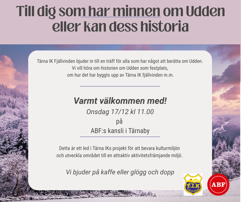 Tärna IK Fjällvinden bjuder in till en träff för alla som har något att berätta om Udden som festplats och annat som hänt under historiens gång.